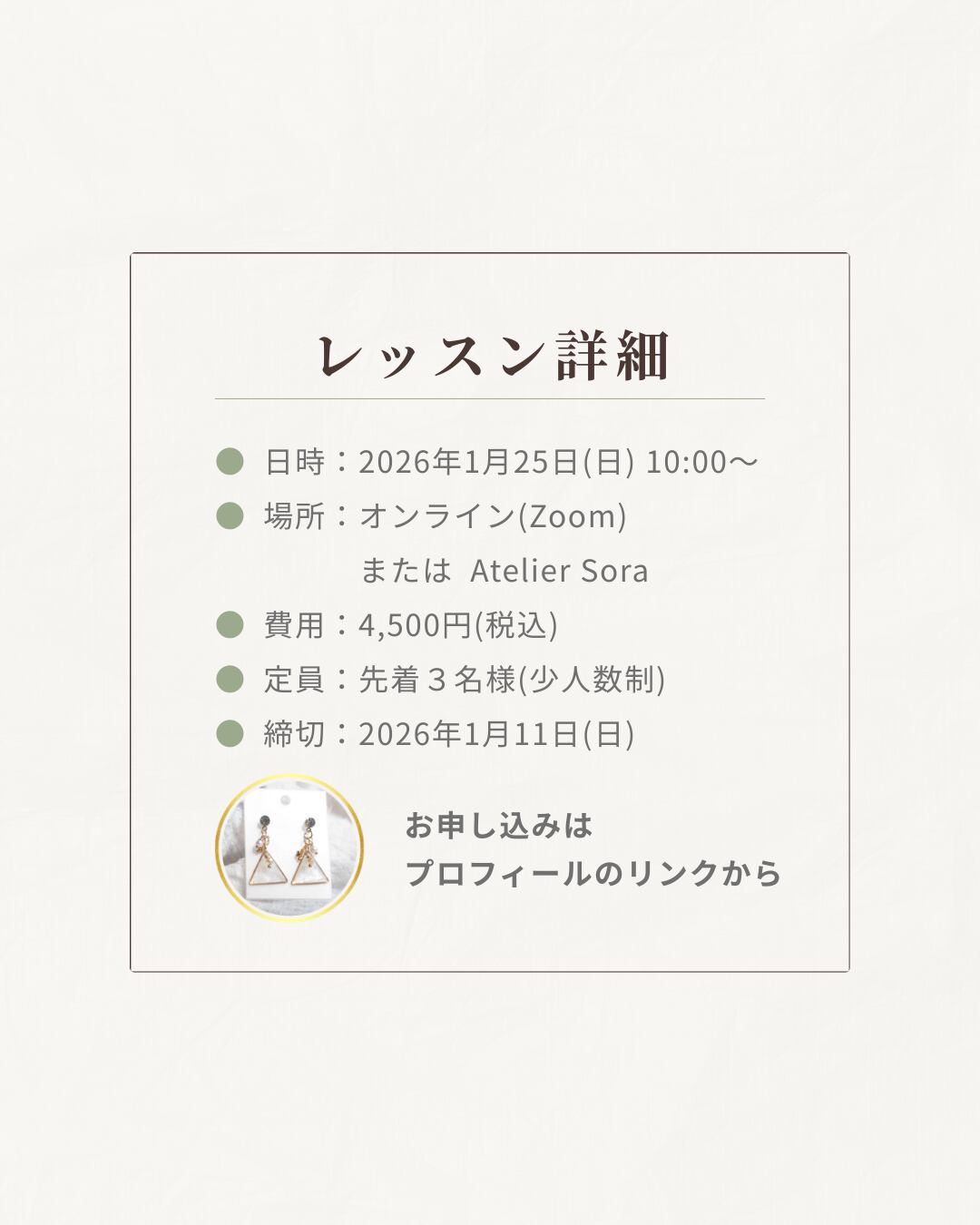 レッスン・ワークショップ・講座・ハンドメイド教室などの告知に特化したテンプレートです。