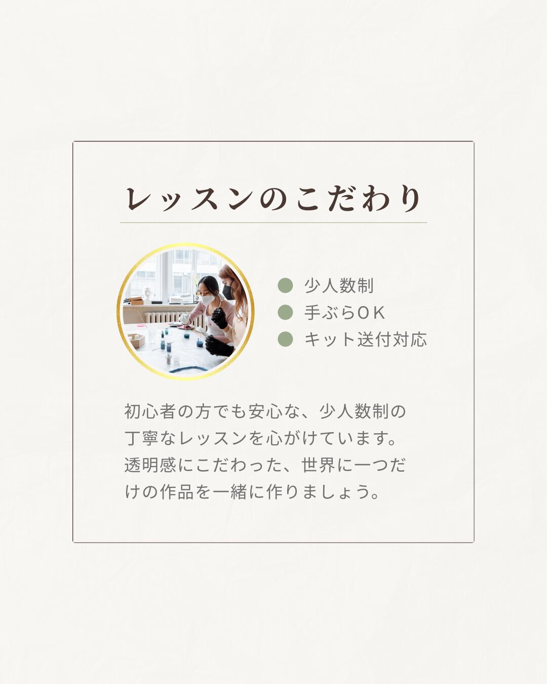 2. こだわり:作家さんの想いや、レッスンの安心感を伝える