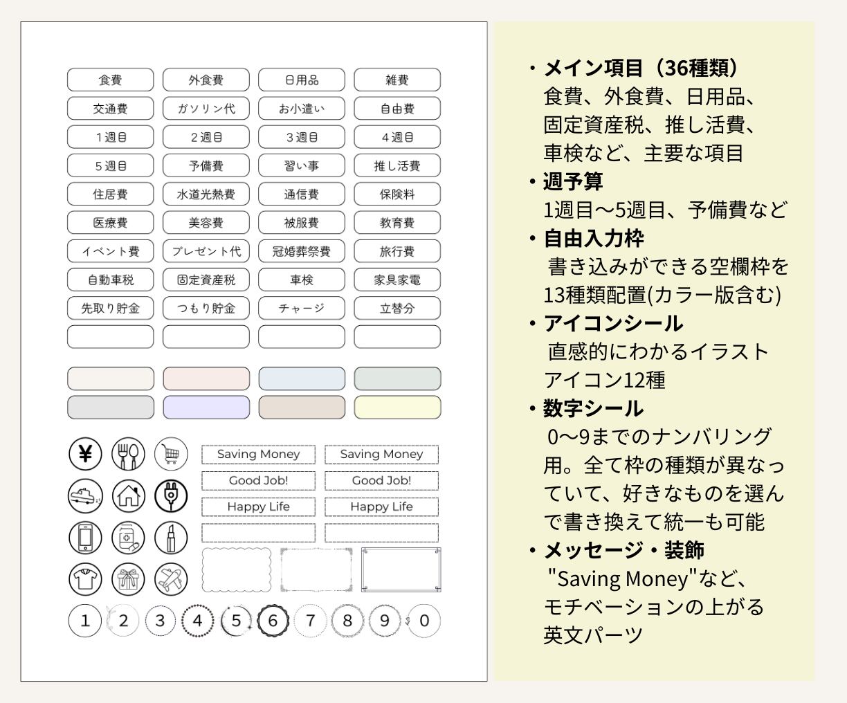 【全60種以上】家計管理ラベルシールセット|スライダーケース用・書き込み枠・アイコン付き|印刷してすぐ使えるデジタル素材|Canva(無料版でOK)