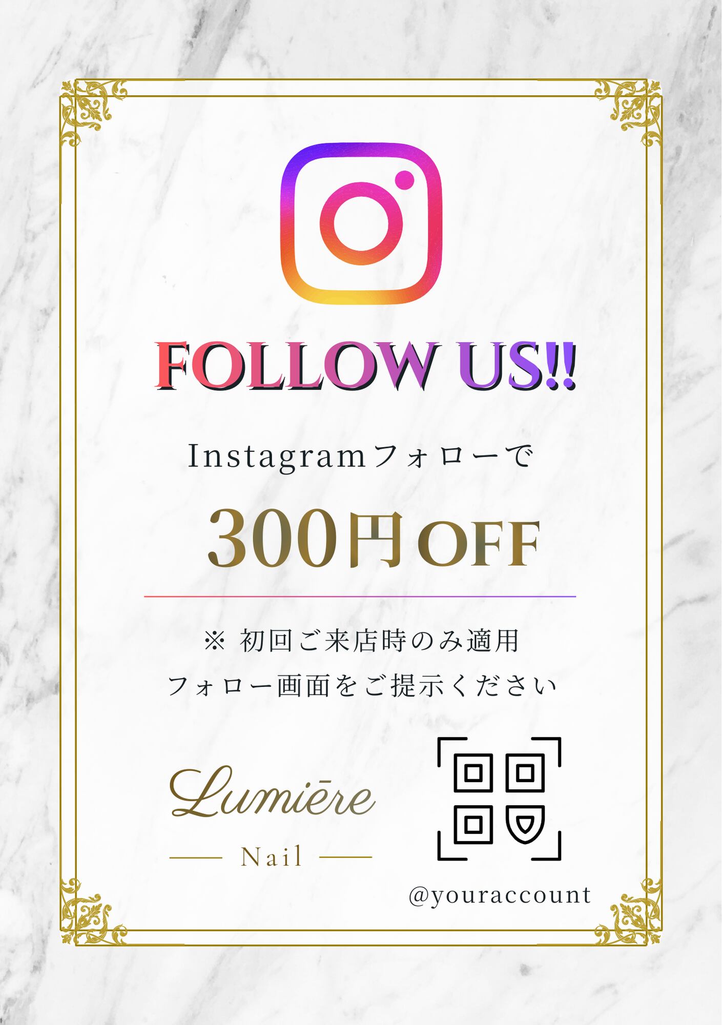 サロン向け|Instagramフォローで割引POPテンプレート(QR配置可・大理石×ゴールド)|Canva