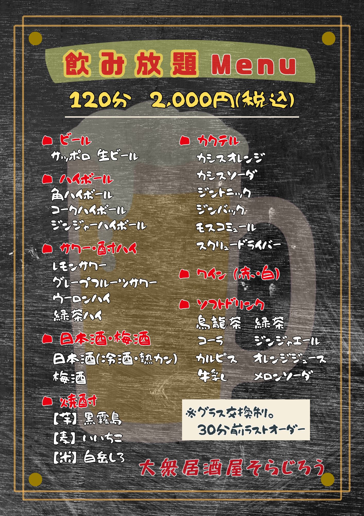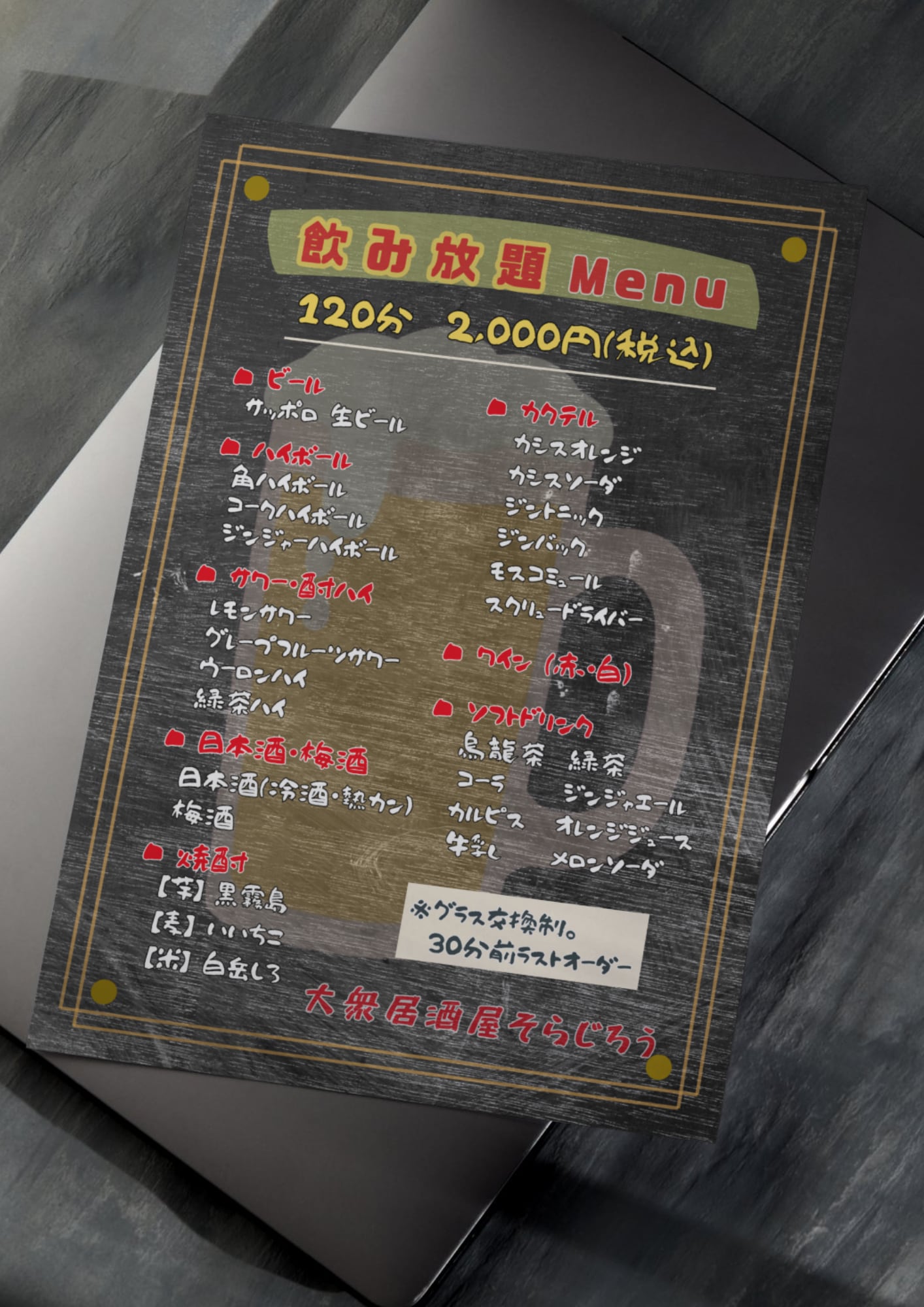 居酒屋飲み放題メニューテンプレート(A4縦・黒板風背景)|注文ルール入りデザイン|Canva
