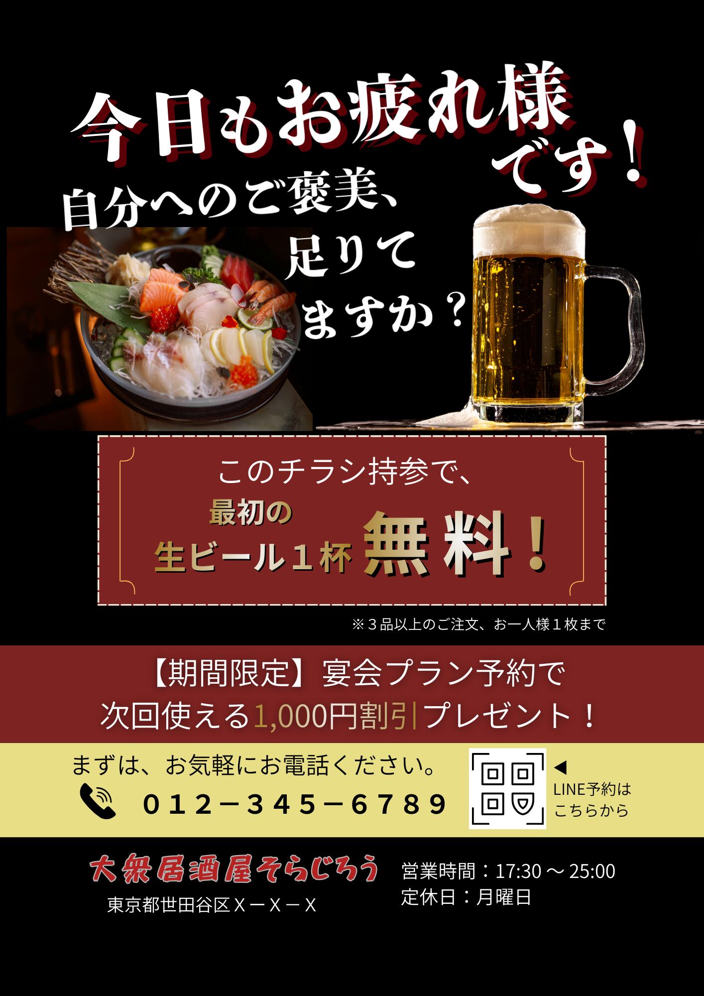 居酒屋・飲食店向けチラシテンプレート(A4縦・両面)ポスティングに【コンテンツ販売】ビール無料クーポン付・宴会予約|Canva