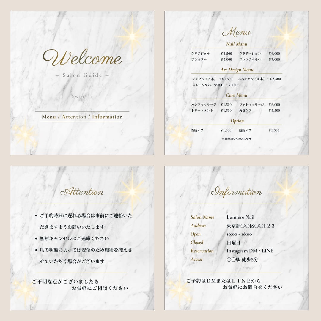 メニュー・POP・カード・Instagram投稿などサロン運営に必要なデザインをまとめました。ゴールド×大理石の高級感のあるデザインで統一感を出しています。
