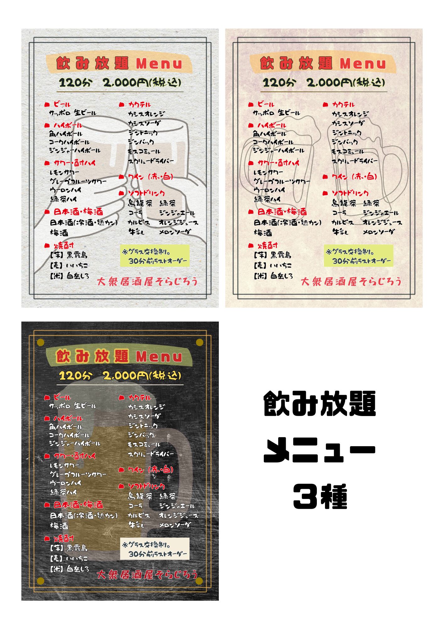 ①表紙・裏表紙1セット②フードメニュー2枚×2種③ドリンクメニュー1枚×3種